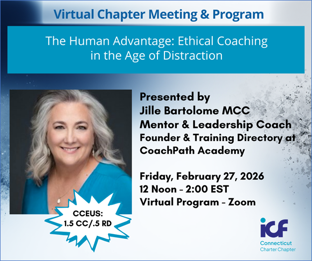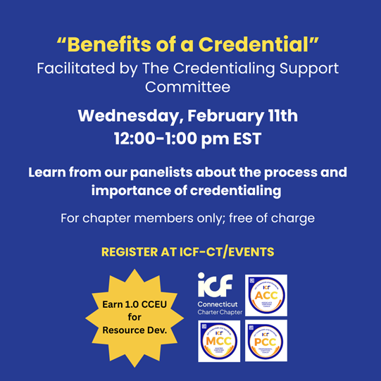 | Wondering if an ICF credential is worth the time and investment? Join us virtually on February 11 at Noon for Benefits of a Credential—a panel conversation with Chapter members who’ve been exactly where you are.