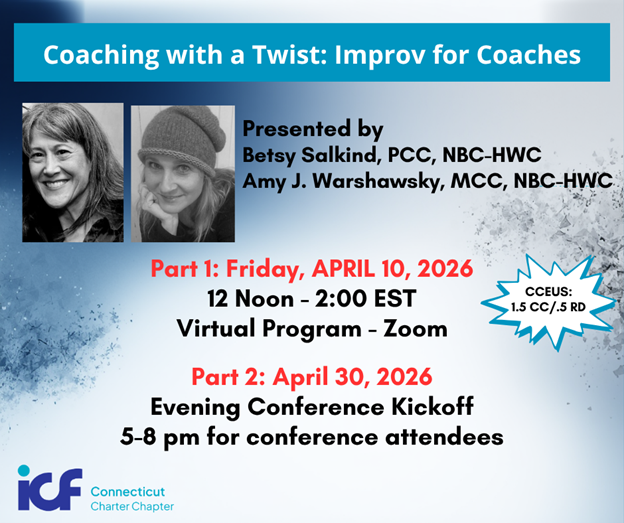 Our chapter’s first inaugural conference kicks off with a special two-part improv experience, Coaching with a Twist: Improv for Coaches, featuring Amy J. Warshawsky & Betsy Salkind!