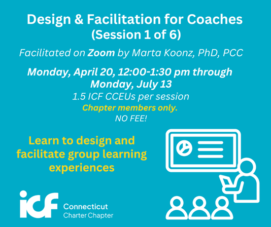 This series of interactive learning sessions is for coaches who are interested in adding facilitated learning experiences to their offerings. Each session mixes new learning and small group discussion to explore a different topic related to designing and delivering group learning opportunities.