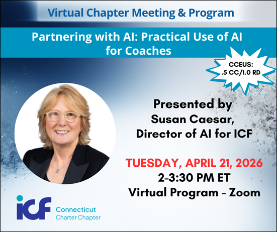 This is a dynamic, hands-on session on April 21 is for coaches who want to use AI with confidence—without compromising ethics, presence, or coaching mastery. You’ll learn a simple, coach-friendly framework for what to delegate to AI, what to protect, and what to never outsource, then see real examples you can apply immediately: faster session prep, sharper questions, clearer theme-spotting, stronger between-session practices, and better follow-through that keeps the client in the driver’s seat. Our presenter, Susan Caesar, serves as the Director of Artificial Intelligence for ICF. She will also cover the essentials of responsible use—confidentiality, consent, bias, and data safety.
