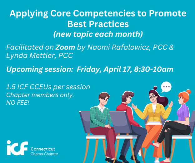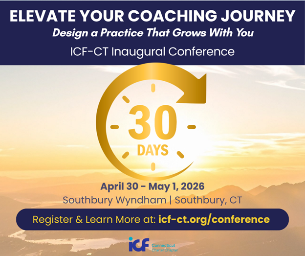 The countdown is on - there are just 30 days until the inaugural conference of ICF-CT, April 30-May 1. Don’t miss this exciting, valuable and informational event, packed with sessions that encourage coaches to pause, reflect, connect, and intentionally design a practice that grows with them—professionally, personally, and sustainably. It starts with our evening kickoff workshop, “Improv for Coaches” on Thursday, followed on Friday by our inspirational keynote presenter Ranieka Weston, PCC and an exciting lineup of dynamic workshop presenters. Attendees can earn a total of 9.25 CCEUs (4.75 Core Competency, 4.5 Resource Development). Check out the full agenda and all the details at icf-ct.org/conference.